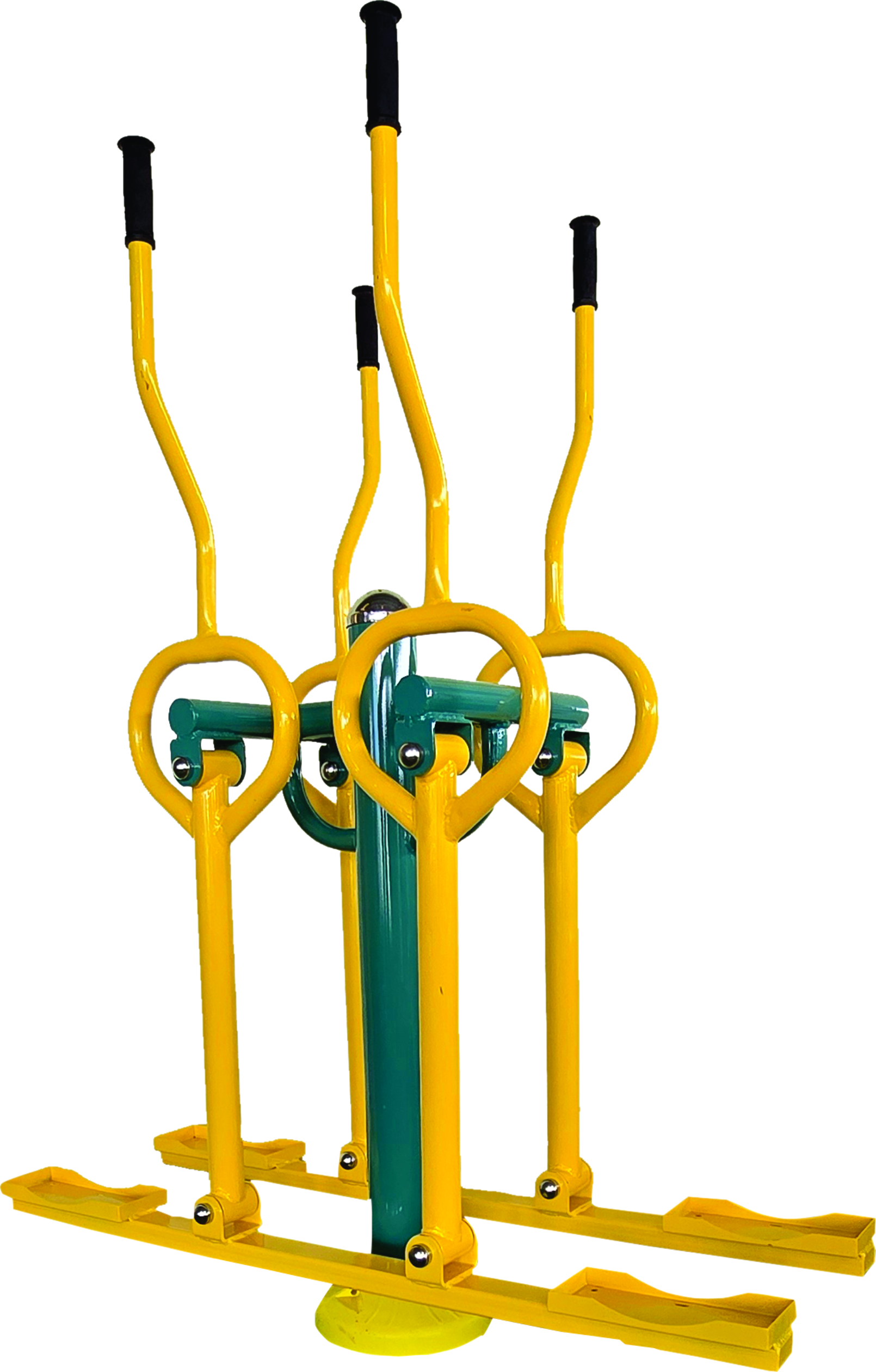 A two-user sky walker trainer system for low-impact cardio workouts with a partner at outdoor fitness gym.